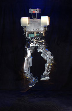 Dexter (5'10" tall, 135 pounds) balances dynamically on two legs, walks, and jumps. Its joints, driven by air cylinders, are springy and flexible like human muscle. There are no stable postures that it can be put in where it can balance without active feedback, so it has to constantly adjust based on its sense of balance -- the robot equivalent of your inner ear.