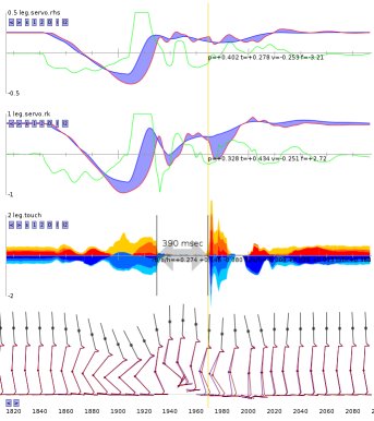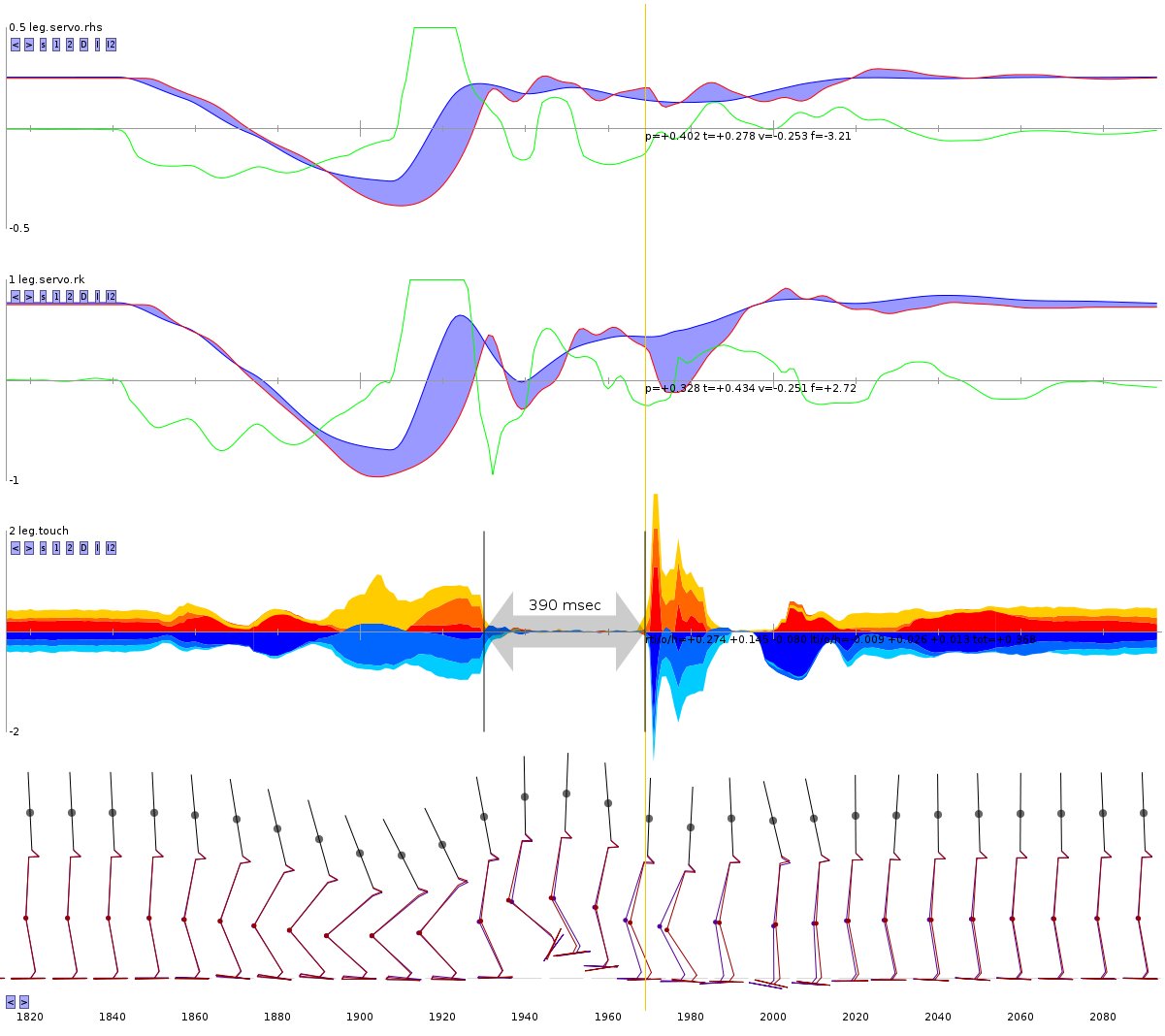 You can see in the screen shot of our analysis tool below that the hang time was about 390 milliseconds. (The colorful part shows the forces on the feet, which are near zero when it's in the air.) The body got 150 mm (6") above its standing height, and the feet 280 mm (11") off the ground. The longest claim I've heard for humanoid "in the air" time is 80 milliseconds for ASIMO, so we're almost 5X longer, corresponding to 25X higher (height varies with the square of time.)